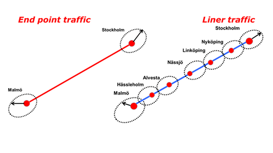 Several smaller terminals with the distance between the terminals of 15 miles, which means that there are opportunities to carry out the distribution with the help of electrically driven distribution vehicles. A finely meshed and efficient transport network that can meet the higher requirements for low energy consumption and low CO2 emissions. The environmental requirements for a future structure are met. This will of course require an expansion of the existing railway network. There really isn't any other option.