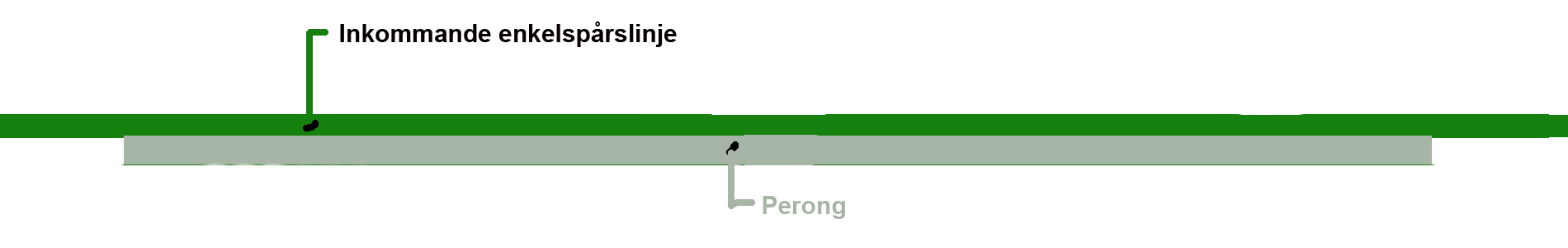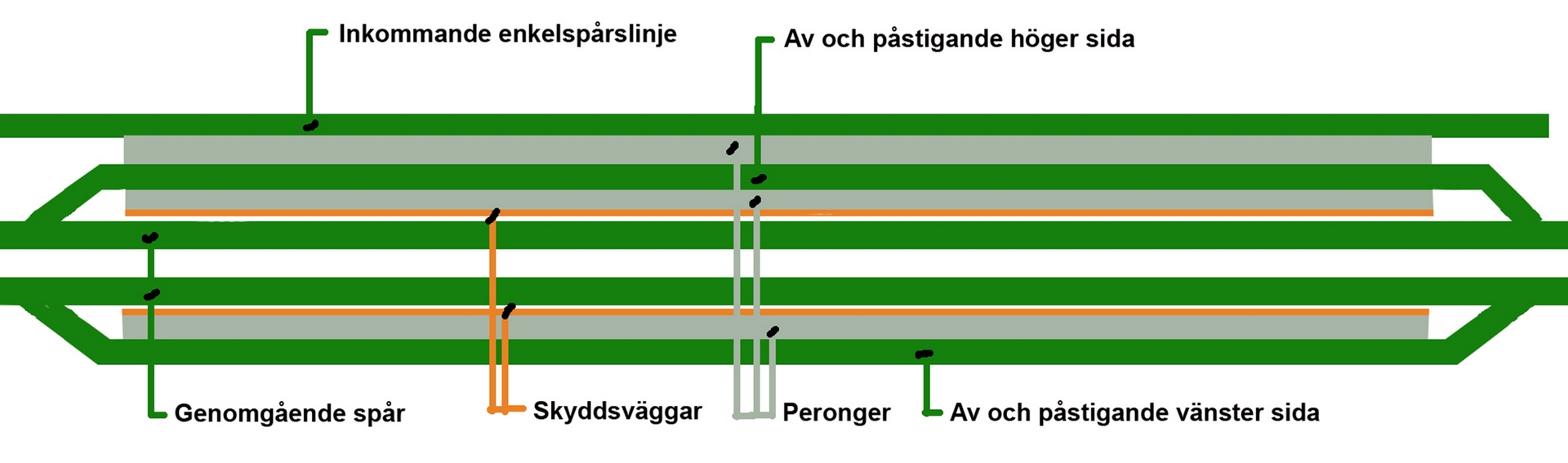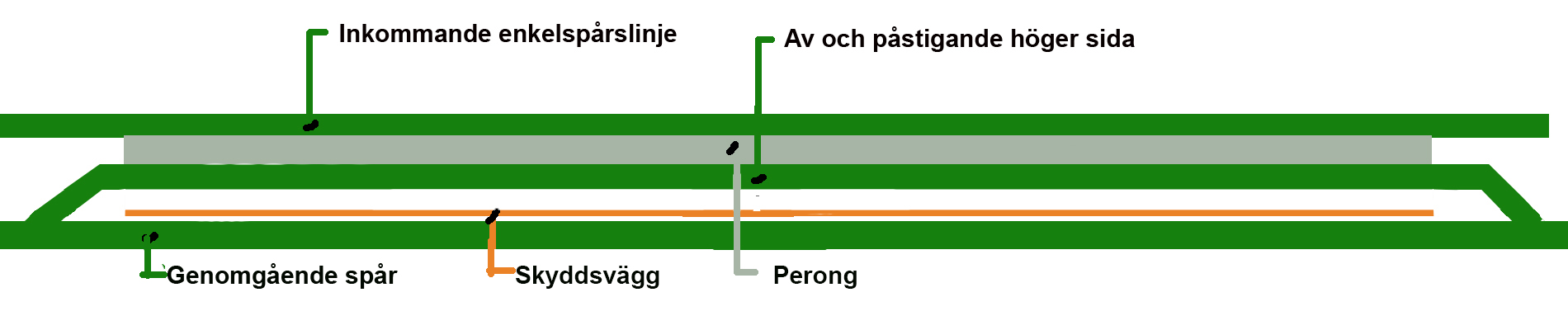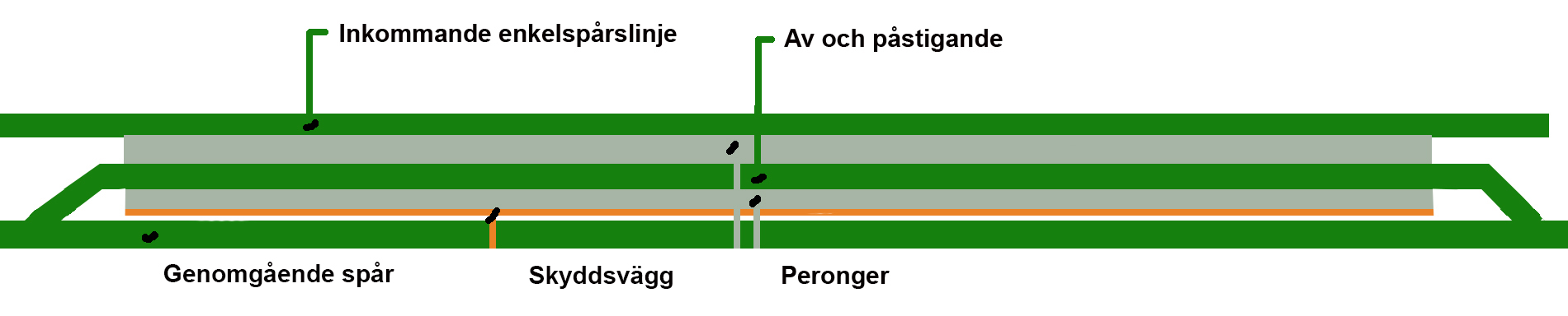 A very efficient terminal where there are opportunities to derail traffic in both directions. Here, traffic can also pass at full speed on the through tracks. A protective wall to ensure that the waiting passengers are not affected by the fast passing trains on the central tracks.